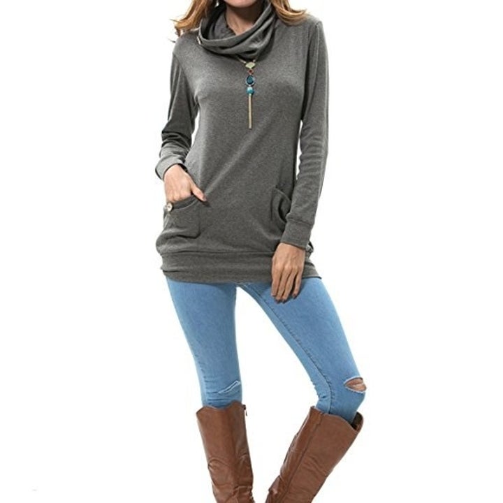 Promising Review: "Very cute and versatile, it will pair well with leggings or skinny jeans. I wear a size medium, and it fit perfectly. The fabric is soft, and not too thick, but not too thin, either. It's almost like the weight of a thin sweatshirt. Perfect for fall weather, or you could layer a jacket on top for winter. Love this sweater." —Amazon Customer